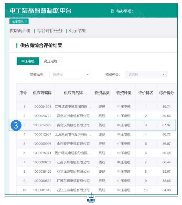 國家電網(wǎng)公司近期發(fā)布的2023年下半年互聯(lián)供應(yīng)商綠色智造云網(wǎng)(EIP)接入能力與應(yīng)用質(zhì)量綜合評價中,青島漢纜股份有限公司憑借其在高壓電纜品類的卓越表現(xiàn)榮登榜首,并在中壓電纜品類中榮獲第三名佳績,充分展示了公司在推進(jìn)綠色智能制造和“云監(jiān)造”業(yè)務(wù)方面的強(qiáng)大實力與領(lǐng)導(dǎo)地位。