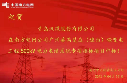 4月7日,青島漢纜股份有限公司接到南方電網(wǎng)物資有限公司的中標(biāo)通知,公司贏得中國(guó)南方電網(wǎng)公司首個(gè)500kV電纜系統(tǒng)重大合同:廣州楚庭(穗西)輸變電工程提供500kV超高壓交流電力電纜及附件。該合同進(jìn)一步深化了南方電網(wǎng)與漢纜股份的合作,為南方電網(wǎng)公司提供世界一流的電力保障,助力粵港澳大灣區(qū)的社會(huì)經(jīng)濟(jì)發(fā)展。項(xiàng)目將全線在電力電纜隧道中安裝總長(zhǎng)約67km的青島漢纜供貨的500kV,2500mm2超高壓交流電力電纜和電纜附件,中標(biāo)金額約2.6億元。